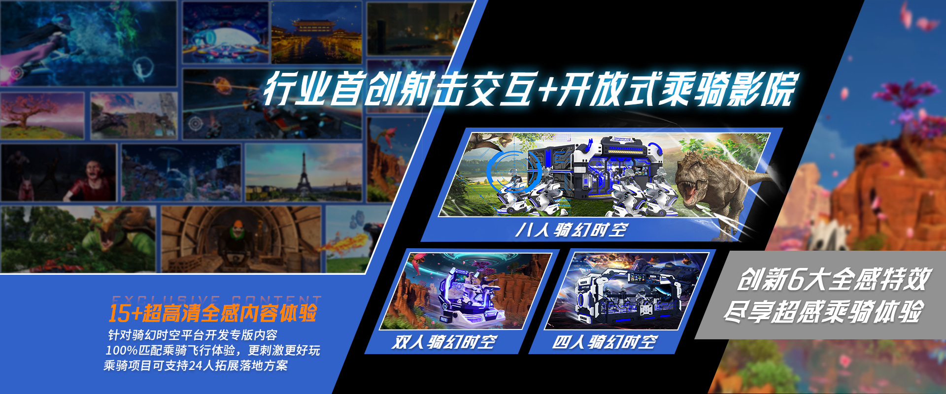 公司現(xiàn)已擁有知名“穿越時空(VART)”VR品牌完整產(chǎn)品線,主推VR元宇宙主題樂園,XR研學基地、LBE大空間定制、5D/7D/軌道/球幕影院/乘騎等定制項目方案。